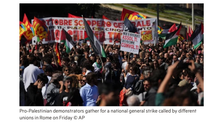 Her government was faced with the second general Strike to support Palestine in two weeks – and massive demonstrations across Italy to support Palestine (See shot from Financial Times above). Meloni remains for now dismissive: