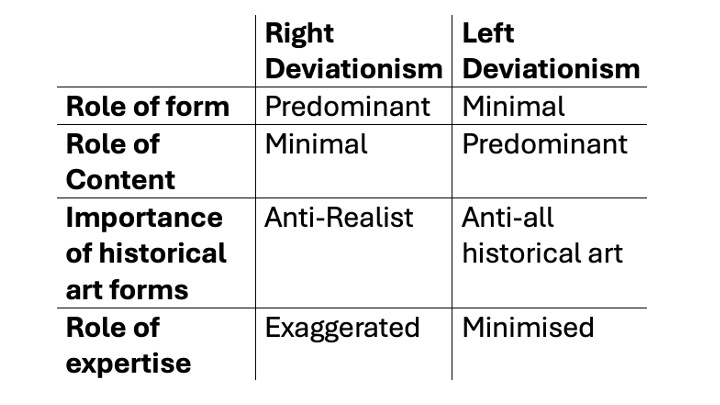 Some Liberals will argue that in any case, it is irrelevant what it is meant by ‘formalism’. Their position is that it is an artists’ ‘right’ for their work to be beyond any state criticism. That position is one of a right for ‘art for art’s sake’. Trotskyists do not generally go so far, and most of them will agree that art is socially conditioned. But they will then – if they follow Trotsky faithfully – say the workers state has to be neutral in matters of art. Marxist-Leninists argue in contrast that a socialist state – or a state constructing such a society – has all rights to proffer criticism and guidance for benefits of state support.