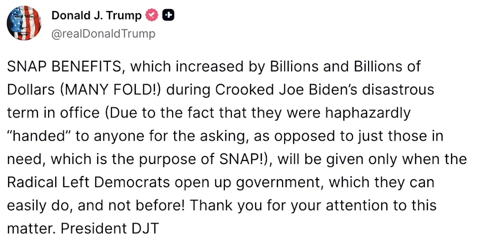 “The Trump administration is using the lives of 42 million people who rely on SNAP as political blackmail. Two-thirds of recipients are in households with children… Already, 5 percent of US households are classified as suffering from “very low food security,” a government euphemism for households forced to reduce food intake or skip meals altogether.”