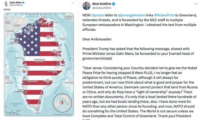 Image: On left a provocative map of Greenland captioned “Soon” as posted January 7th on X by Katie Miller – wife of Steven Miller (White House deputy chief of staff for policy and homeland security advisor) from Yahoo News; on right USA President Trump’s text to Prime Minister Jonas Gahr Støre, of Norway