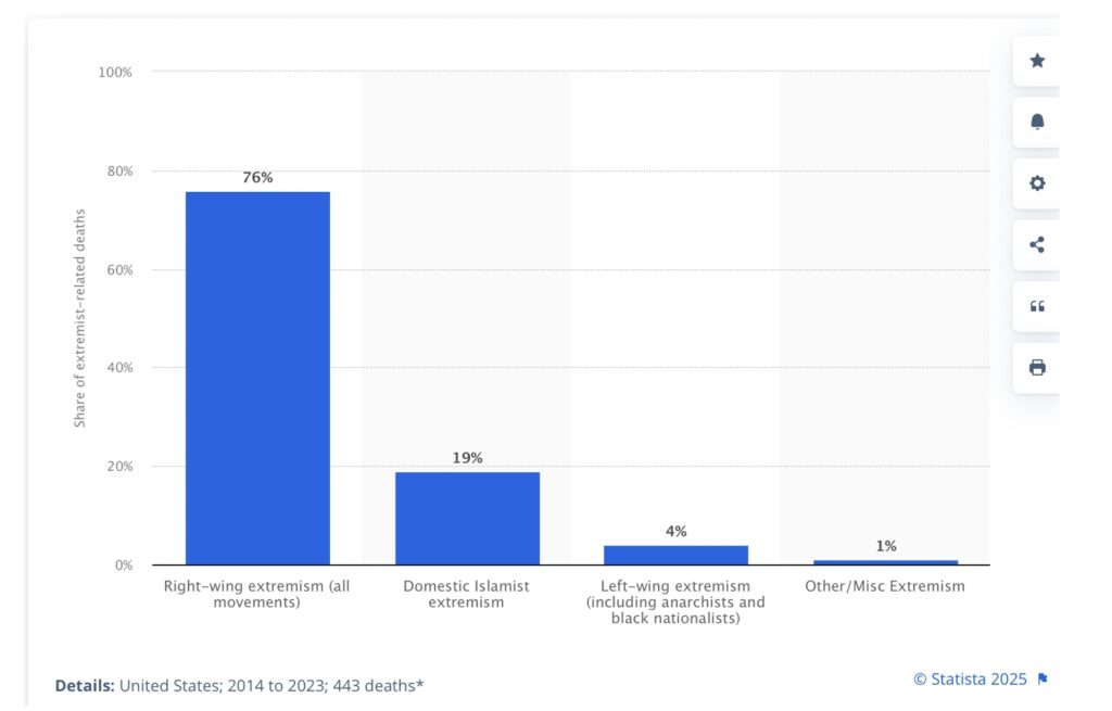 In recent decades, the following chart indicates the prevalence of right-wing individual terror in the United States at a rate of 19 to 1 (76% to 4%), even eclipsing incidents attributed to political Islam during the peak of anti-Muslim hysteria during the first Trump administration.