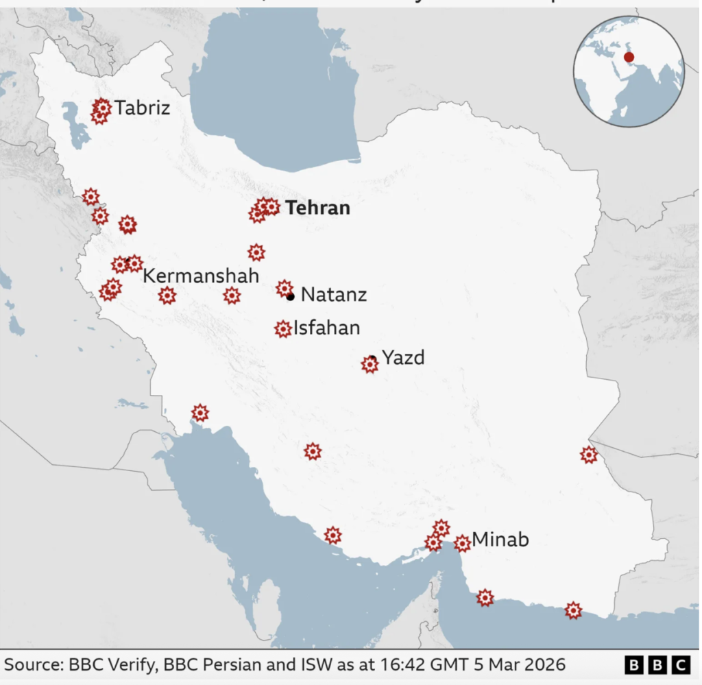 As they strive to achieve this ‘regime change’, the war is steadily widening. See BBC Maps. Map 1 (Sites hit by the imperialists inside Iran from BBC “In Maps Strikes across the Middle East” March 5 2026): .